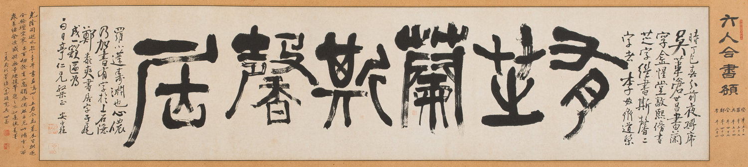 안중식, 김돈희, 오세창, 이도영, 나수연, 정태석 6인이 '유지란사형거有芝蘭斯馨居'를 순서대로 한 글자씩 써서 완성한, 유례가 드문 합작서 편액 글씨이다. 서체와 글씨의 균형을 잘 맞추어 한 사람이 쓴 듯 완성도가 높은 글씨이다. 이 편액 글씨는 임실 출신으로 한일은행 전무, 동양척식주식회사 감사로 활동했던 대부호인 일정 백인기日亭 白寅基(1882-1942)에게 써준 것이다. 글씨 좌우에는 안중식이 글씨를 쓴 인물들의 명단과 수신인을 적었다.