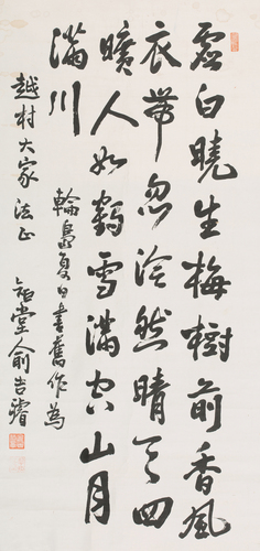 處白曉生梅樹前 香風衣帶忽泠然 晴天四曠人如鶴 雪滿空山月滿川 새벽빛 깃든 매화나무 앞에 서니, 향기로운 바람이 옷자락 사이로 문득 서늘히 스쳐 오네. 맑게 갠 하늘 아래 사방은 탁 트이고 사람은 학처럼 고고하며, 빈 산에는 눈이 가득하고 시내에는 달빛이 가득하네.