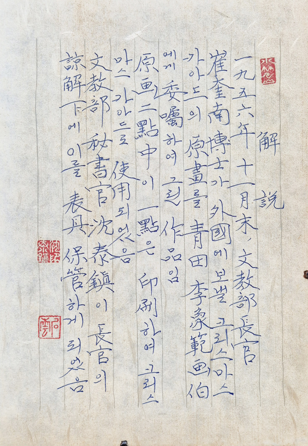 1956년 10월 말 문교부장관 최규남 박사가 외국에 보낼 크리스마스 카드의 원화를 청전 이상범 화백에게 위촉하여 그린 작품이다. 원화 두 점 중에 한 점은 인쇄하여 크리스마스 카드로 사용되었다. 문교부 비서관 심태진이 장관의 양해하에 이를 표구 보관하게 되었다.