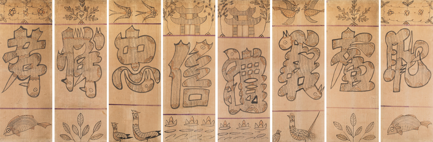 각 화면을 3단으로 구성하여 중앙에는 문자를, 상단과 하단에는 제주도에 자생하는 물고기와 새, 나무, 꽃, 누각 등을 배치한 제주문자도 8폭 병풍이다.